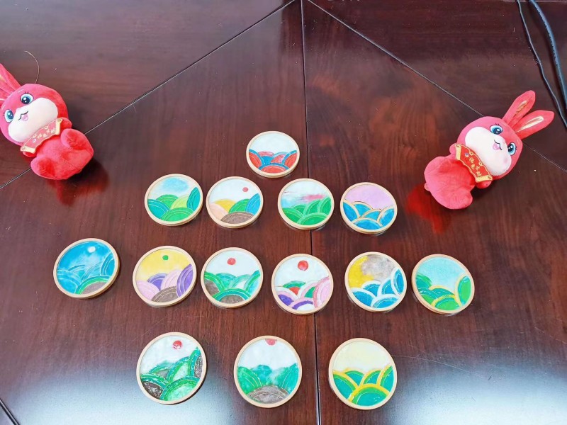 課上,單文靜詳細(xì)介紹了掐絲琺瑯彩畫的歷史淵源、發(fā)展歷程和工藝流程,并現(xiàn)場(chǎng)教授創(chuàng)作技巧和色彩搭配,培養(yǎng)大家對(duì)琺瑯彩畫藝術(shù)的審美情趣。在場(chǎng)人員聚精會(huì)神地傾聽(tīng)、觀看,相互討論交流。隨后,在老師的指導(dǎo)下,大家用自己的巧手和智慧,按照“掐絲-洗沙-點(diǎn)彩”的步驟,制作出了一個(gè)個(gè)極具個(gè)性、各具韻味的掐絲琺瑯畫杯墊。