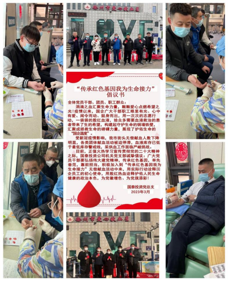 國泰投資黨總支發(fā)出了“傳承紅色基因 我為生命接力”無償獻血的活動倡議。國泰職工眼里有光,心中有愛,聞令而動,挺身而出,共計22名職工參與其中,累計獻血7200毫升,用忠誠熱血詮釋初心使命,展現了無私奉獻護佑生命的“國企溫度”。