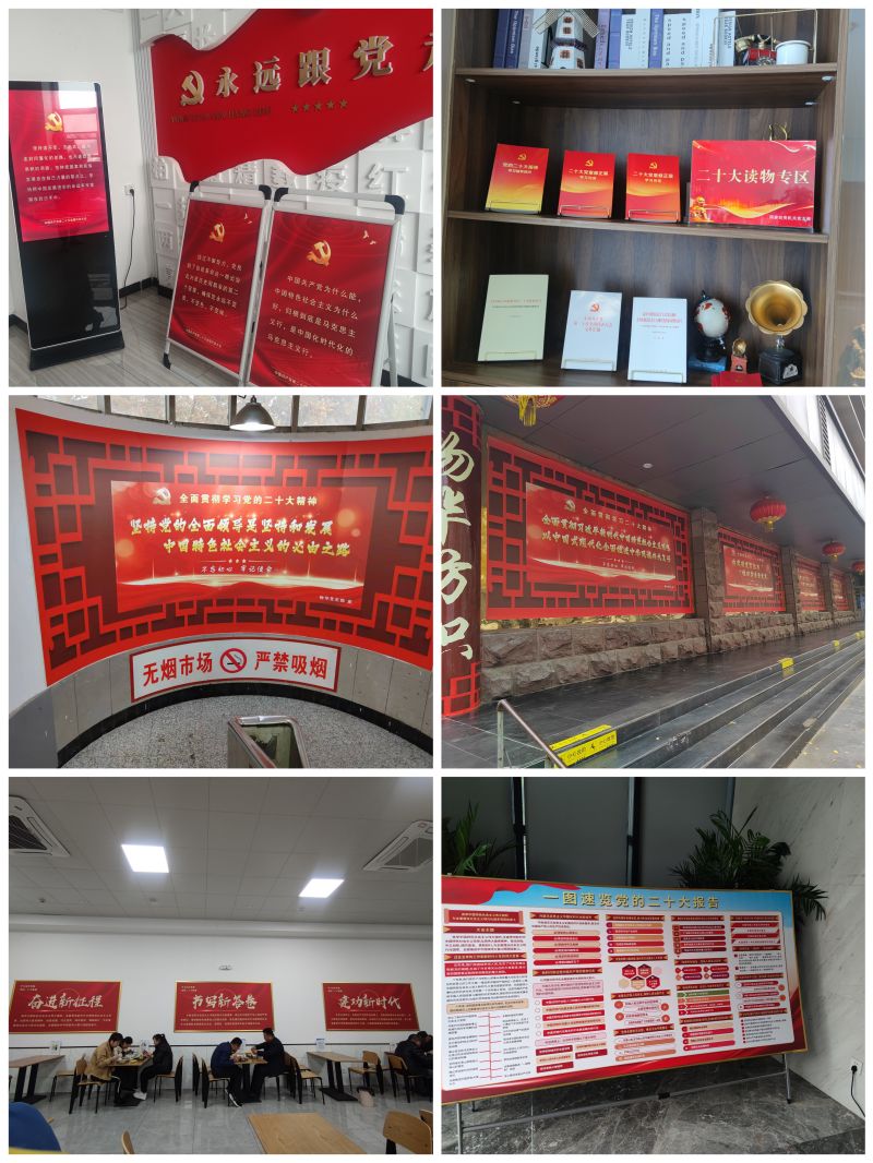 為深入學(xué)習(xí)宣傳貫徹黨的二十大精神,公司各所屬黨支部全方位營(yíng)造濃厚學(xué)習(xí)氛圍:在電梯口、文化走廊、職工食堂等場(chǎng)所懸掛二十大精神金句宣傳展板及橫幅;在休息區(qū)增設(shè)二十大圖書角,放置二十大精神學(xué)習(xí)圖書及相關(guān)輔導(dǎo)讀本;利用電子屏幕滾動(dòng)播放二十大精神金句圖片,在職工食堂用電視播放中國(guó)共產(chǎn)黨國(guó)際形象網(wǎng)宣片、二十大微視頻等,讓大家“抬頭看得見、隨處可以學(xué)、時(shí)時(shí)能感受”,積極營(yíng)造出了全面貫徹學(xué)習(xí)黨的二十大精神的濃厚學(xué)習(xí)氛圍,引導(dǎo)全體黨員干部職工在學(xué)習(xí)中明方向,在感悟中找坐標(biāo),全方位、多角度地宣貫二十大精神影響力。