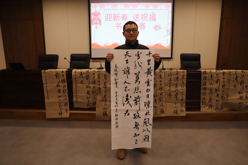 比賽期間,參賽選手們盡情揮毫潑墨,抒發(fā)著對書法的熱愛??瑫n勁有力,既有雄健的力度,又不失柔和之美;隸書古樸典雅,方正中透著嚴(yán)謹(jǐn),散發(fā)著渾厚而莊重的藝術(shù)氣息;行書如高山流水、瀟灑飄逸,不因時勢之變化而易其形,故能歷久彌新。比賽引來眾多同事駐足觀看,大家圍聚一起,一幅幅地欣賞著、回味著,對喜歡的作品更是贊不絕口......現(xiàn)場洋溢著迎新春的喜悅。最終經(jīng)過評委組綜合評定,吳霽洲同志榮獲本次書法比賽一等獎。