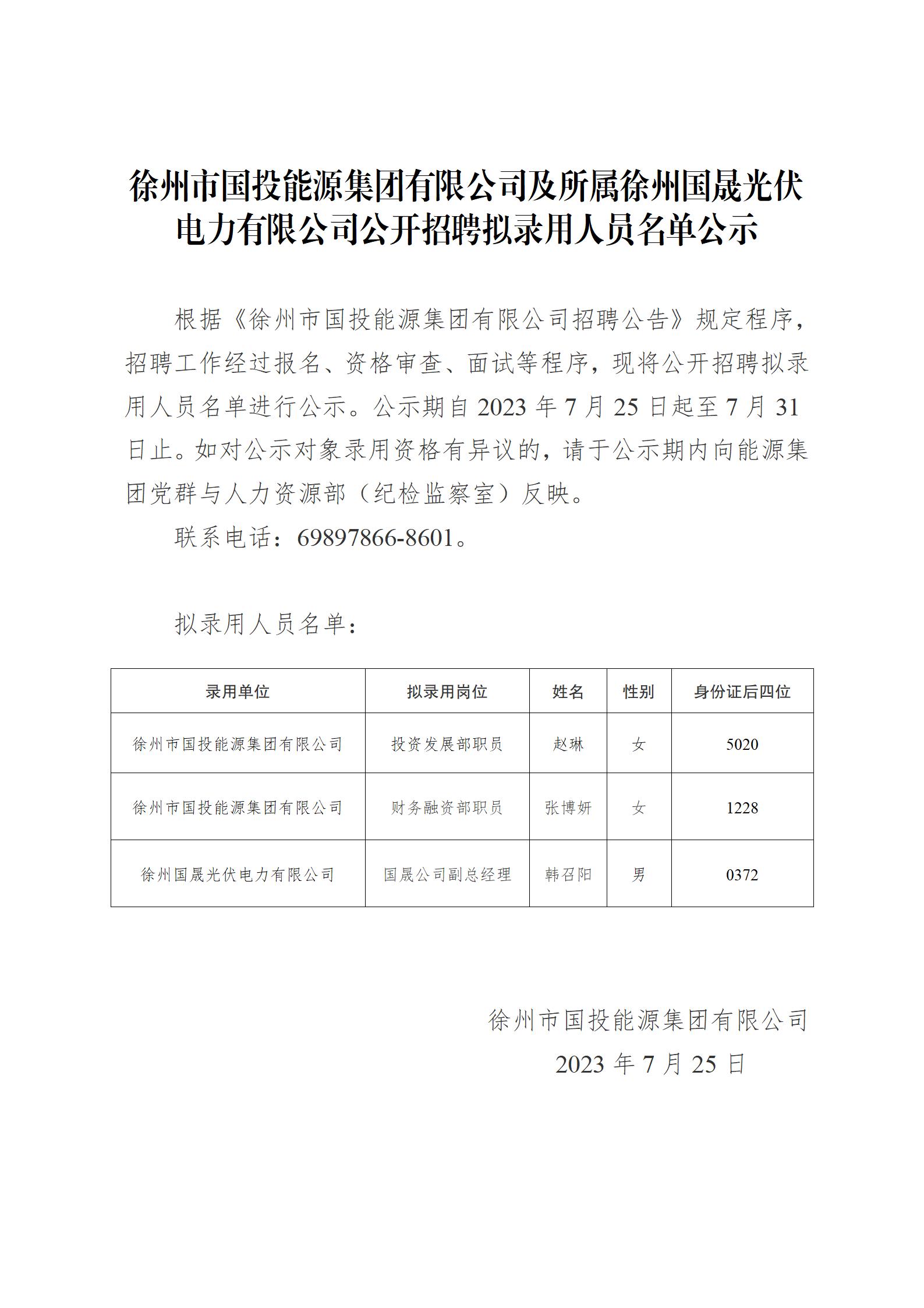 徐州市國(guó)投能源集團(tuán)有限公司及所屬徐州國(guó)晟光伏電力有限公司公開(kāi)招聘擬錄用人員名單公示