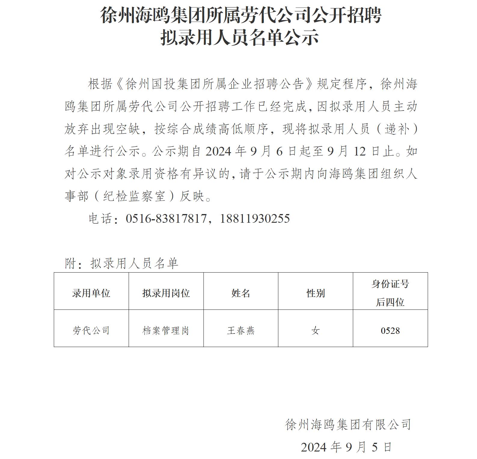 徐州海鷗集團(tuán)所屬勞代公司公開招聘擬錄用人員名單公示