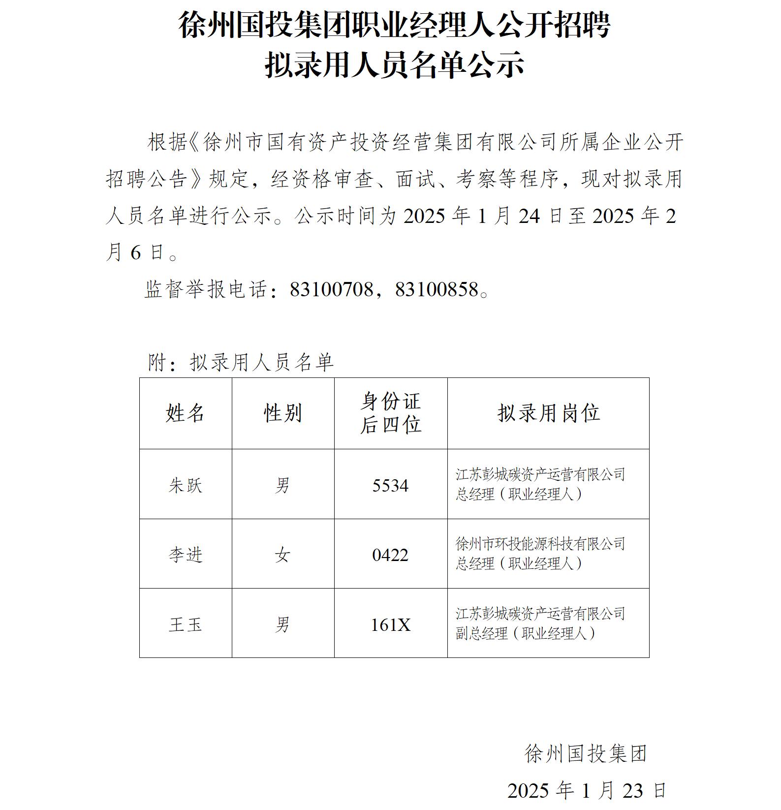 徐州國投集團職業(yè)經(jīng)理人公開招聘擬錄用人員名單公示