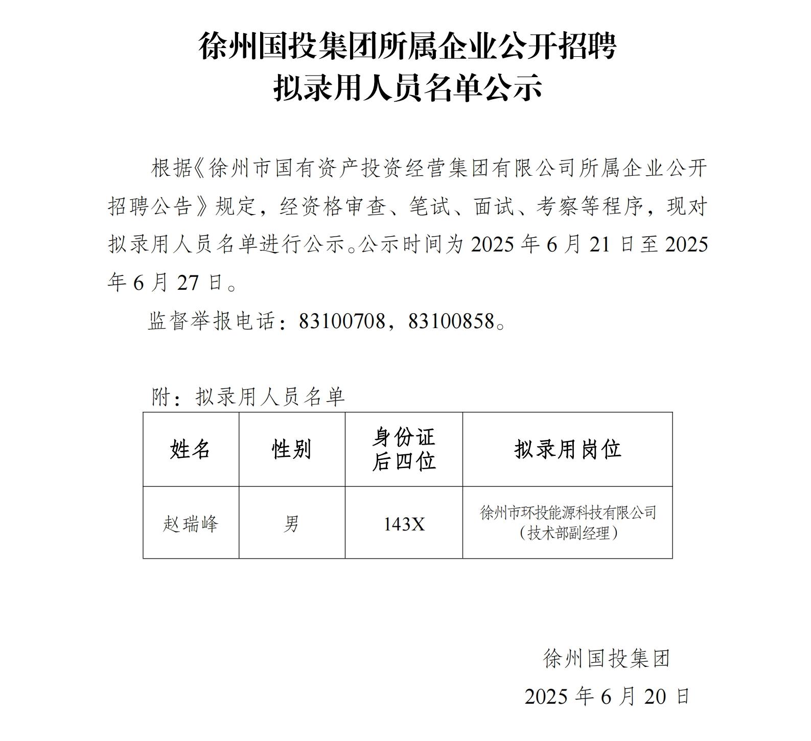 徐州國(guó)投集團(tuán)所屬企業(yè)公開招聘擬錄用人員名單公示