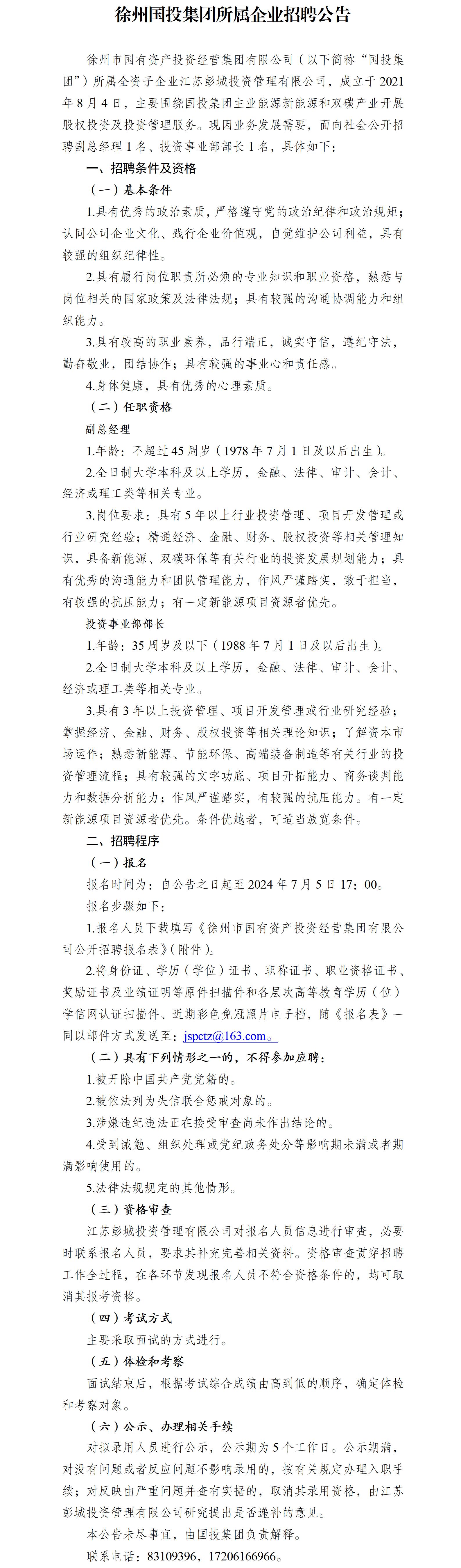 徐州市國有資產(chǎn)投資經(jīng)營集團有限公司所屬企業(yè)公開招聘公告