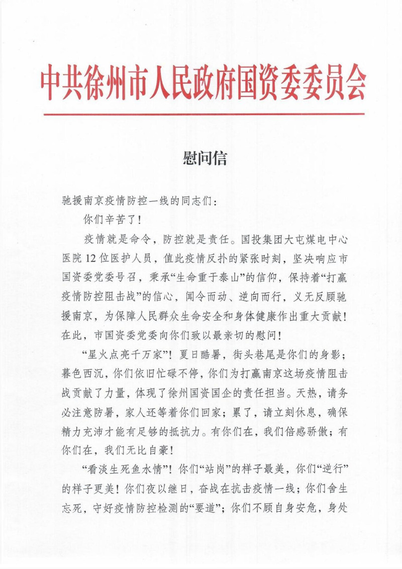 市國(guó)資委向馳援南京新冠疫情防控一線的徐州國(guó)投大屯煤電中心醫(yī)院的同志致慰問(wèn)信