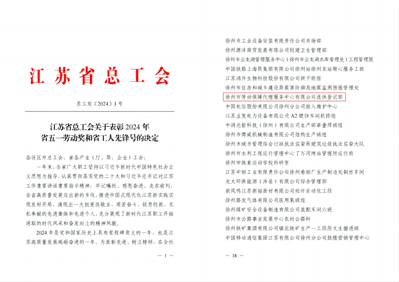 近日,江蘇省總工會下發(fā)《江蘇省總工會關于表彰2024年省五一勞動獎和省工人先鋒號的決定》(蘇工發(fā)〔2024〕3號),徐州國投集團所屬徐州市勞動保障代理服務中心有限公司退休登記部獲“江蘇省工人先鋒號”榮譽稱號。長期以來,勞代公司退休登記部作為窗口服務部門,以創(chuàng)建人民滿…