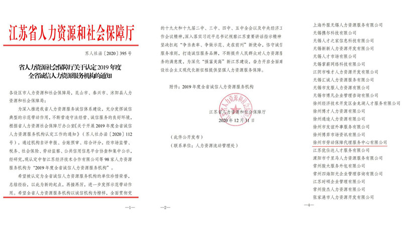 勞代公司被認(rèn)定為“2019年度江蘇省誠信人力資源服務(wù)機(jī)構(gòu)”