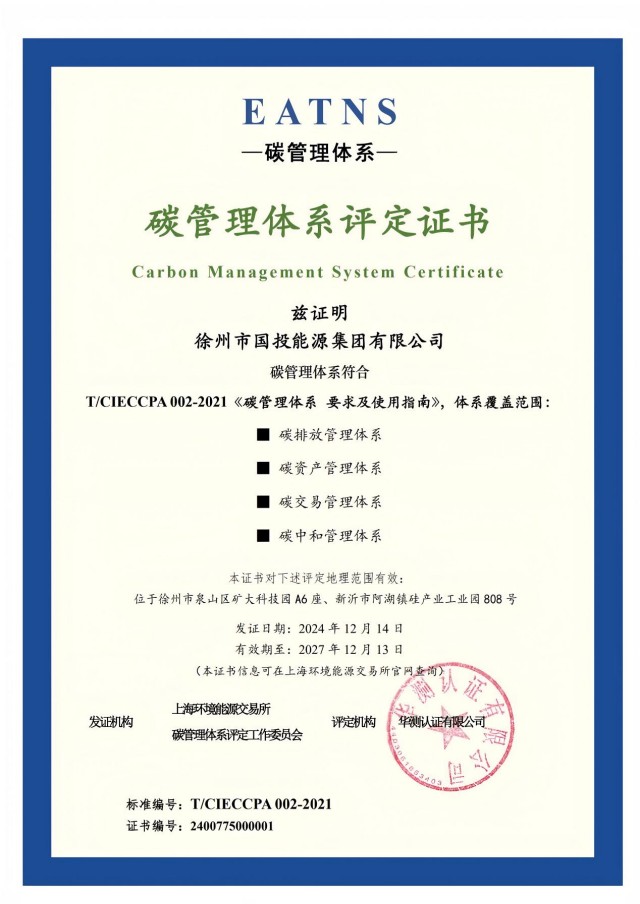 近日,在江蘇彭城碳資產(chǎn)運(yùn)營(yíng)有限公司的專業(yè)咨詢協(xié)助下,經(jīng)華測(cè)認(rèn)證有限公司專家組的嚴(yán)格評(píng)審,能源集團(tuán)成功通過碳管理體系認(rèn)證審核,并獲得由上海環(huán)境能源交易所頒發(fā)的EATNS碳管理體系證書,成為全市率先獲得該體系認(rèn)證的企業(yè)。同時(shí),碳資信評(píng)價(jià)等級(jí)實(shí)現(xiàn)AA,標(biāo)志著企業(yè)在“雙碳…