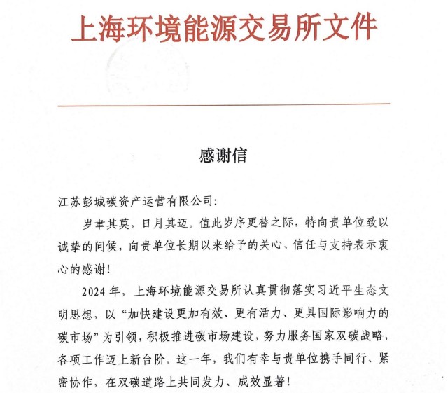 上海環(huán)境能源交易所致彭城碳資產(chǎn)公司的感謝信