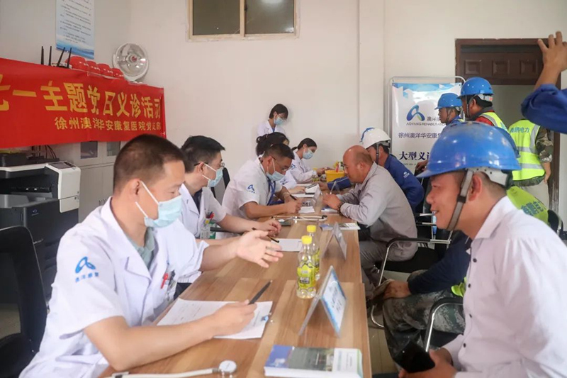 徐州澳洋華安康復(fù)醫(yī)院的醫(yī)務(wù)人員深入項(xiàng)目建設(shè)現(xiàn)場(chǎng),為奮戰(zhàn)在建設(shè)一線的施工及管理人員開展義診活動(dòng)?;顒?dòng)中,醫(yī)療專家和醫(yī)護(hù)團(tuán)隊(duì)細(xì)心嚴(yán)謹(jǐn)為每一位一線工人進(jìn)行血壓血糖檢測(cè)、用藥指導(dǎo)、身心健康問題解答等。本次義診活動(dòng)現(xiàn)場(chǎng)氣氛和諧融洽,讓項(xiàng)目全體員工深切感受到了黨組織的溫暖和關(guān)懷。