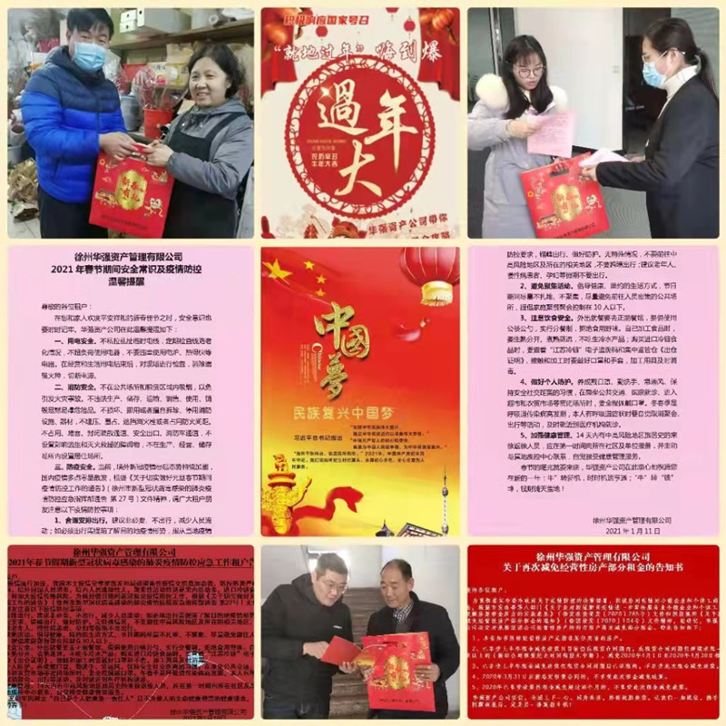 乘著辭舊迎新的東風(fēng),在新春佳節(jié)來(lái)臨之際,為積極響應(yīng)國(guó)家衛(wèi)健委和徐州市政府“就地過(guò)年”行動(dòng)號(hào)召,華強(qiáng)資產(chǎn)公司策劃了以“2021——華強(qiáng)與你,年在一起”為主題的新春送“福”暖心年味客戶答謝活動(dòng),為就地過(guò)年的租戶營(yíng)造溫暖的節(jié)日氛圍。2月1日起,資產(chǎn)部租賃專員將滿載著祝福與關(guān)懷的福袋送到各自管轄的租戶手中,向多年來(lái)支持公司發(fā)展的租戶表示感謝,進(jìn)一步提升了租戶對(duì)公司的認(rèn)同感和歸屬感。