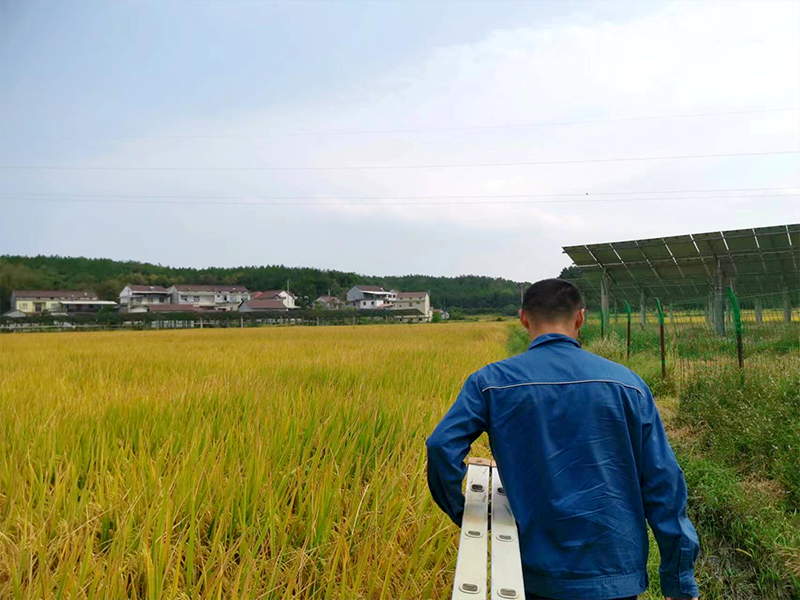 太湖鑫能電站位于安慶山區(qū),總裝機容量2萬千瓦,占地面積647畝,分別在三個不同地方,區(qū)域跨度大、道路條件差,有些光伏區(qū)甚至無法通車,只能攜帶沉甸甸的維修設(shè)備徒步前行,身體和設(shè)備維修都面臨著極大考驗。10月1日上午11時,驕陽似火,“秋老虎”的回歸使氣溫重返36度。電站班長謝文理帶領(lǐng)巡檢人員走在狹窄的田埂上,厚重的工作服下早已滲滿了汗水,他們已經(jīng)徒步巡檢了3公里的線路,走在最前面的謝文理在匯報完工作進(jìn)度后,轉(zhuǎn)頭對同行人員說“12點前必須把這個區(qū)域仔細(xì)巡檢一遍,下午再去剩下的區(qū)域”。說著他加快了腳步,一行人在泥濘的地面上留下了一串串深深的腳印。