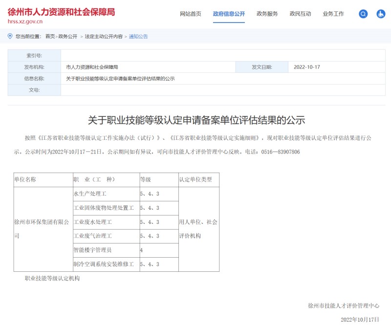 徐州市環(huán)保集團評價中心通過徐州市人力資源和社會保障局審批。按照《江蘇省職業(yè)技能等級認定工作實施辦法(試行)》《江蘇省職業(yè)技能等級認定實施細則》,徐州市環(huán)保集團有限公司成為水生產(chǎn)處理工、工業(yè)固體廢物處理處置工、工業(yè)廢水處理工、工業(yè)廢氣治理工、制冷空調(diào)系統(tǒng)安裝維修工的5、4、3級以及智能樓宇管理員4級的職業(yè)技能等級認定機構。