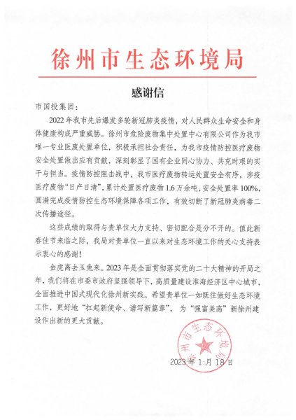 市生態(tài)環(huán)境局對集團公司的感謝信中寫道:“2022年我市先后爆發(fā)多輪新冠肺炎疫情,對人民群眾生命安全和身體健康構(gòu)成嚴重威脅。徐州市危險廢物集中處置中心有限公司作為我市唯一專業(yè)醫(yī)廢處置單位,積極承擔社會責任,為我市疫情防控醫(yī)療廢物安全處置做出應(yīng)有貢獻,深刻彰顯了國有企業(yè)同心協(xié)力、共克時艱的實干與擔當。疫情防控阻擊戰(zhàn)中,我市醫(yī)療廢物轉(zhuǎn)運處置安全有序,涉疫醫(yī)療廢物‘日產(chǎn)日清’,累計處置醫(yī)療廢物1.6萬余噸,安全處置率100%,圓滿完成疫情防控生態(tài)環(huán)境保障各項工作,有效切斷了新冠肺炎病毒二次傳播途徑?!?