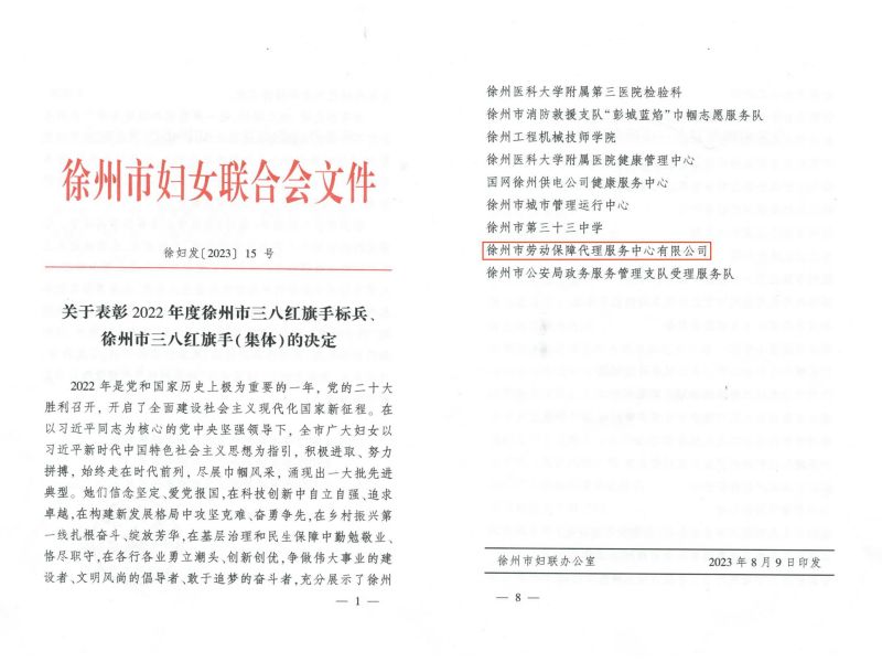 近日,徐州市婦女聯(lián)合會印發(fā)《關于表彰2022年度徐州市三八紅旗標兵、徐州市三八紅旗手(集體)的決定》(徐婦發(fā)〔2023〕15號),徐州國投集團所屬徐州市勞動保障代理服務中心有限公司(以下簡稱“勞代公司”)被授予“徐州市三八紅旗集體”榮譽稱號。