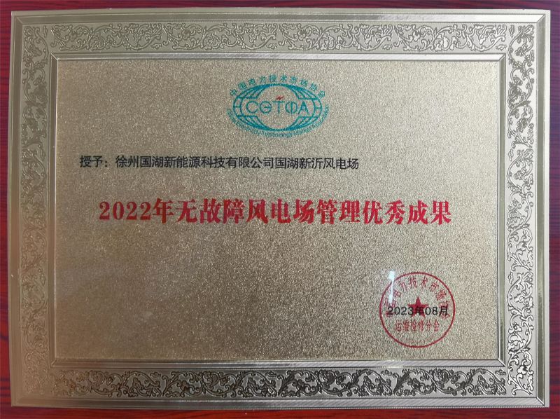 8月24日,徐州國(guó)湖新能源科技有限公司所屬國(guó)湖新沂風(fēng)電場(chǎng)榮獲中國(guó)電力技術(shù)市場(chǎng)協(xié)會(huì)頒發(fā)的“2022年無(wú)故障風(fēng)電場(chǎng)管理優(yōu)秀成果”獎(jiǎng)項(xiàng)。