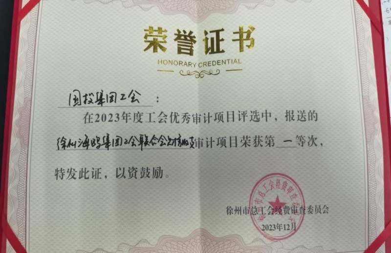 為進一步強化工會經(jīng)審組織監(jiān)督職能,規(guī)范工會審計行為,切實提升工會審計質(zhì)量,市總工會經(jīng)審會開展2023年度工會優(yōu)秀審計項目評選工作,并于近日公布了2023年度工會優(yōu)秀審計項目評選結(jié)果,國投集團選送的審計項目“徐州海鷗集團工會聯(lián)合會財務收支”榮獲第一等次。