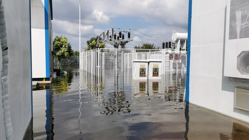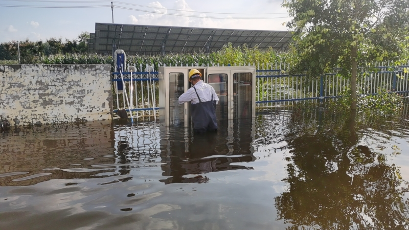 雨勢(shì)越來(lái)越猛,積水也越積越多,同時(shí)電站外面的積水也在向內(nèi)倒灌,遠(yuǎn)遠(yuǎn)望去,站內(nèi)的積水和周邊村莊田地連成一片汪洋。劉忠??粗e水高度的逐步上漲,先是淹到了腳踝,后來(lái)是空調(diào)外機(jī),眼瞅著已經(jīng)到了控制室和設(shè)備艙的臺(tái)階處,“于紀(jì)瑤,你跟我一起去查看積水情況!”兩人合力將地板掀開(kāi),看到下面已經(jīng)是積水?!?0公分,再升高10公分,設(shè)備就會(huì)產(chǎn)生巨大損壞,也會(huì)造成短路風(fēng)險(xiǎn)”劉忠保心里盤(pán)算著,“可是現(xiàn)在拉閘,發(fā)電量也會(huì)造成損失。”他安排電站人員白天全員在崗、夜間輪換值班,通過(guò)24小時(shí)不間斷值守對(duì)站內(nèi)重要設(shè)施進(jìn)行高頻率水位監(jiān)視,密切關(guān)注電纜溝水位與高壓開(kāi)關(guān)柜底部距離、接地變附近水位以及一次、二次室內(nèi)部濕度情況,力爭(zhēng)撐到最后的安全線再拉閘,將損失降到最低。