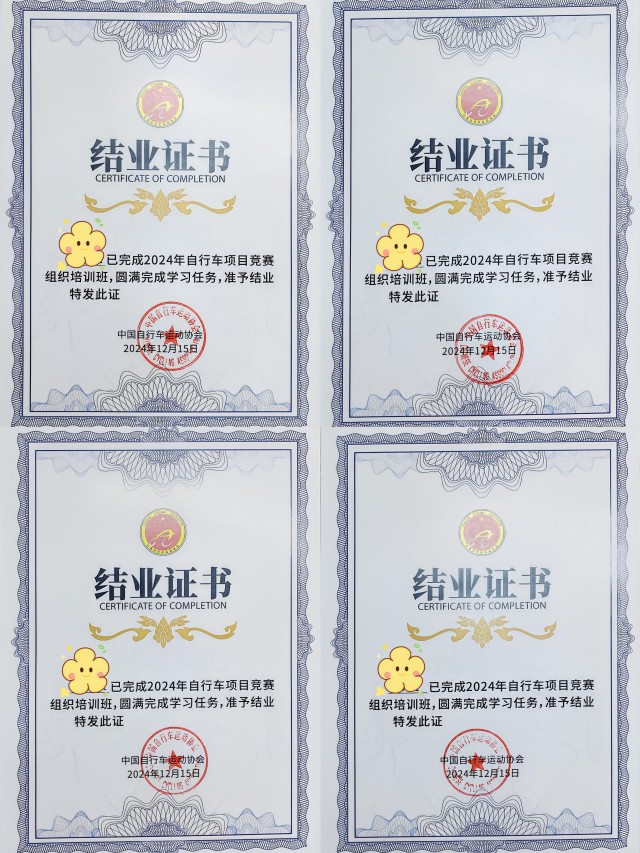 12月中旬,國體文化體育(徐州)有限公司(以下簡稱“國體徐州”)經(jīng)過了嚴格的篩選與審核,選拔了4名競賽組織管理人員參加了中國自行車運動協(xié)會組織的“2024年自行車項目競賽組織培訓”,并通過考核取得結(jié)業(yè)證書。