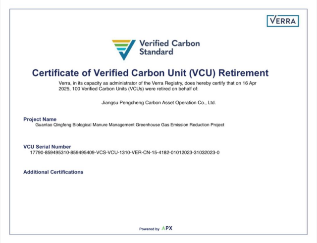 江蘇彭城碳資產(chǎn)運(yùn)營(yíng)有限公司已通過(guò)購(gòu)買國(guó)際自愿減排(VCS):館陶縣慶豐生物科技有限公司糞便管理溫室氣體減排項(xiàng)目,用于活動(dòng)能耗和包括參會(huì)者們?cè)诨顒?dòng)中產(chǎn)生的二氧化碳當(dāng)量溫室氣體排放,實(shí)現(xiàn)活動(dòng)碳中和。