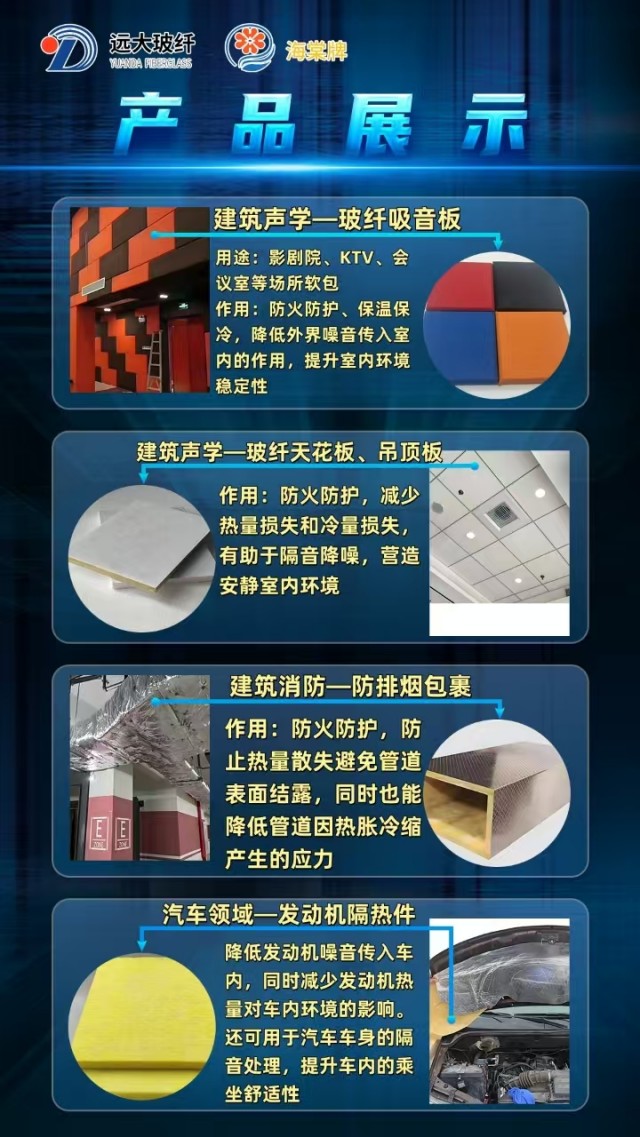 玻璃棉、玻璃棉板、玻璃棉卷氈、高溫玻璃棉卷氈、帶鋁箔玻璃棉板、帶鋁箔玻璃棉卷氈、汽車內飾專用玻璃棉、樓地面隔聲板、無甲醛棕色玻璃棉(板)、無甲醛白色玻璃棉(板)、防排煙道專用包裹材料等、防排煙風管、玻璃棉管殼。
