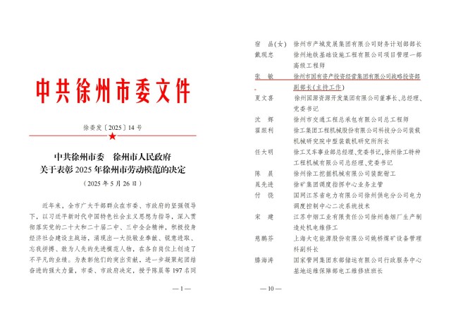 2025年5月28日,徐州市勞動(dòng)模范表彰大會(huì)召開,徐州國投集團(tuán)戰(zhàn)略投資部副部長(主持工作)張敏榮獲“徐州市勞動(dòng)模范”稱號(hào)!