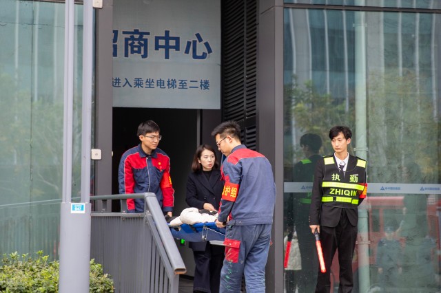 15:30,演練正式啟動。消控室值班人員發(fā)現(xiàn)消防主機報警后,立即查看著火點信息,迅速通知巡邏崗前往核實。巡邏崗抵達(dá)513室后,發(fā)現(xiàn)現(xiàn)場濃煙冒出且有被困人員,立即向中控室報告。通訊聯(lián)絡(luò)組隨即啟動應(yīng)急程序,將消防主機切換為自動狀態(tài),并向總指揮匯報火情。總指揮果斷下達(dá)指令,各專項小組迅速響應(yīng),按照預(yù)案展開行動。隨著滅火行動組成功撲滅全部明火,各小組依次向總指揮匯報任務(wù)完成情況,滅火救援綜合實戰(zhàn)演練部分圓滿結(jié)束。