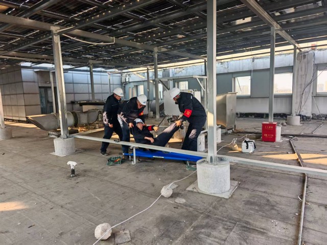 演練緊扣“安全第一、預(yù)防為主、綜合治理”方針,模擬電站運維人員在屋頂進(jìn)行逆變器檢修時,不慎觸及裸露電纜導(dǎo)致觸電昏迷的緊急場景。活動現(xiàn)場,隨著總指揮一聲令下,演練正式拉開序幕。參演人員迅速進(jìn)入角色,從事故發(fā)現(xiàn)、電源切斷、脫離電源、現(xiàn)場救護(hù)到啟動心肺復(fù)蘇、撥打急救電話,整個流程緊張有序、銜接緊密?,F(xiàn)場救援人員反應(yīng)迅速、操作規(guī)范,充分展現(xiàn)了扎實的安全技能和高效的團(tuán)隊協(xié)作能力。
